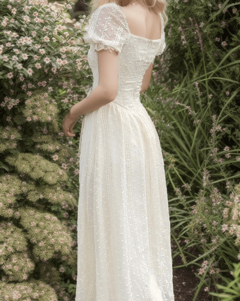 Discover a timeless look in the Lace Flower Square Neck Backless Corset Dress. An elegant ivory style with lace floral patterning and a-line fit that'll have you feeling like a classic beauty. Accented with puff sleeves and a backless silhouette, this dress is ideal for a cottagecore or fairycore look. Get ready to turn heads.