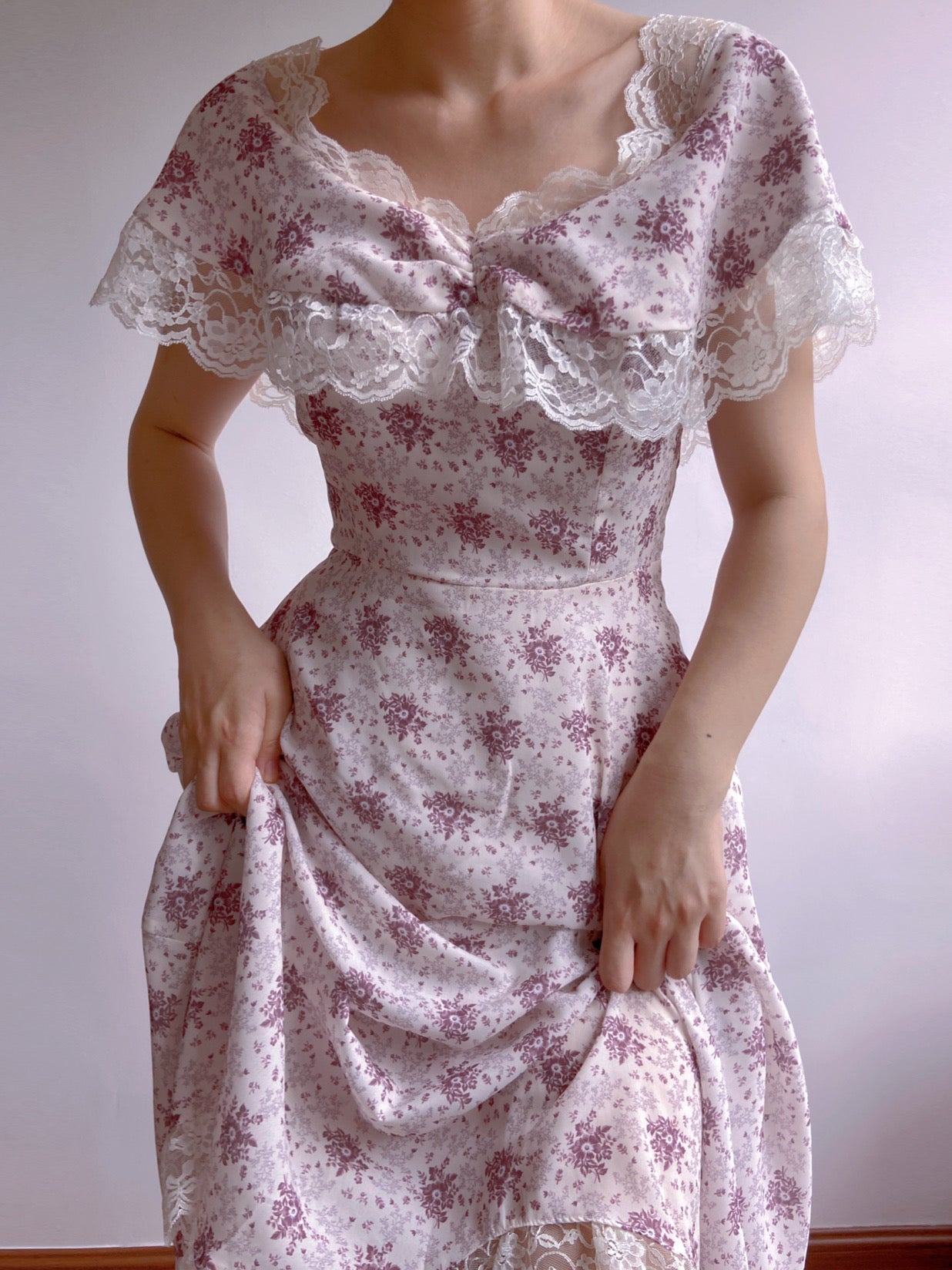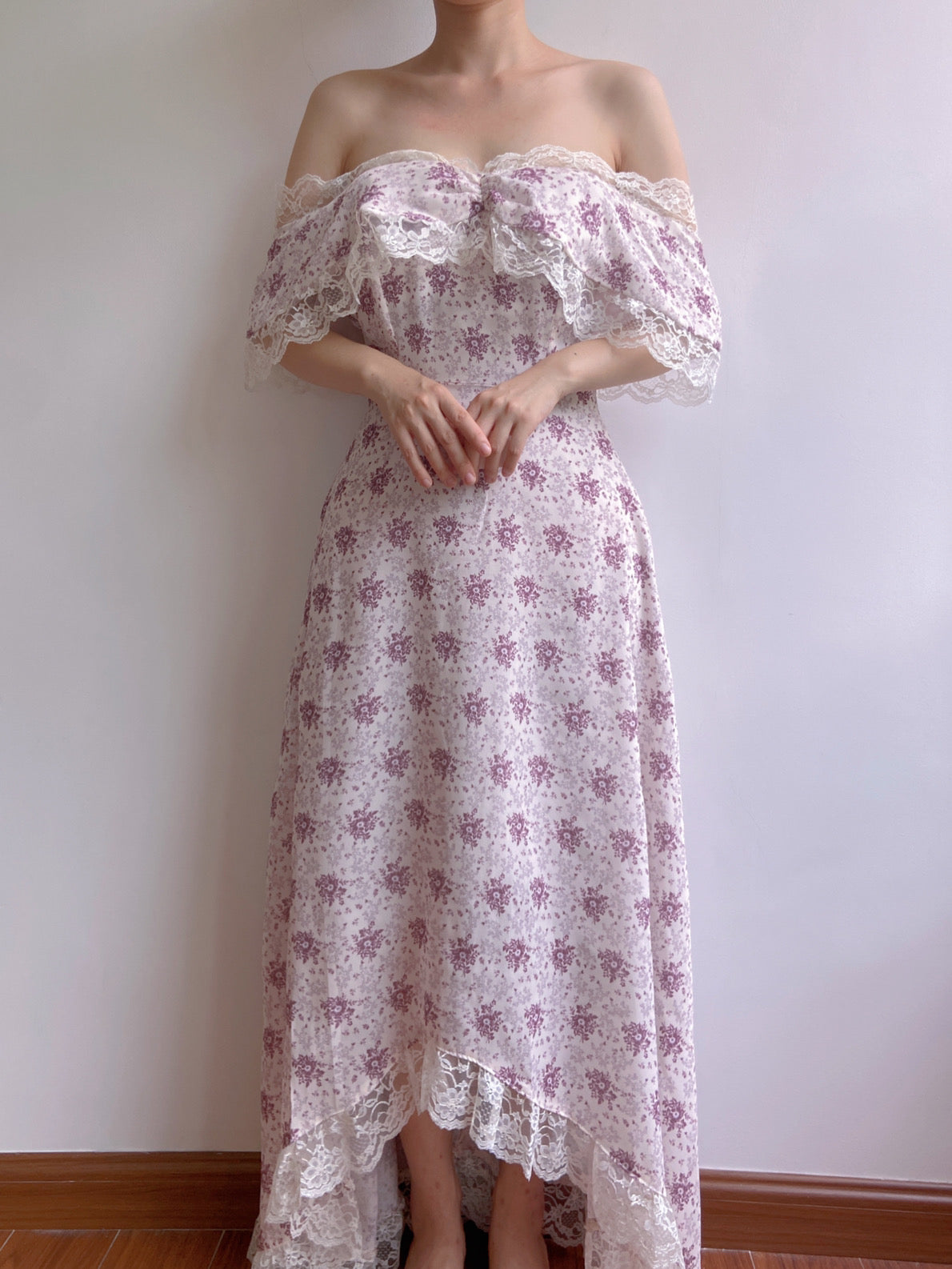 - Details: Off-shoulder, Ruffles, Floral, Lace around the neckline