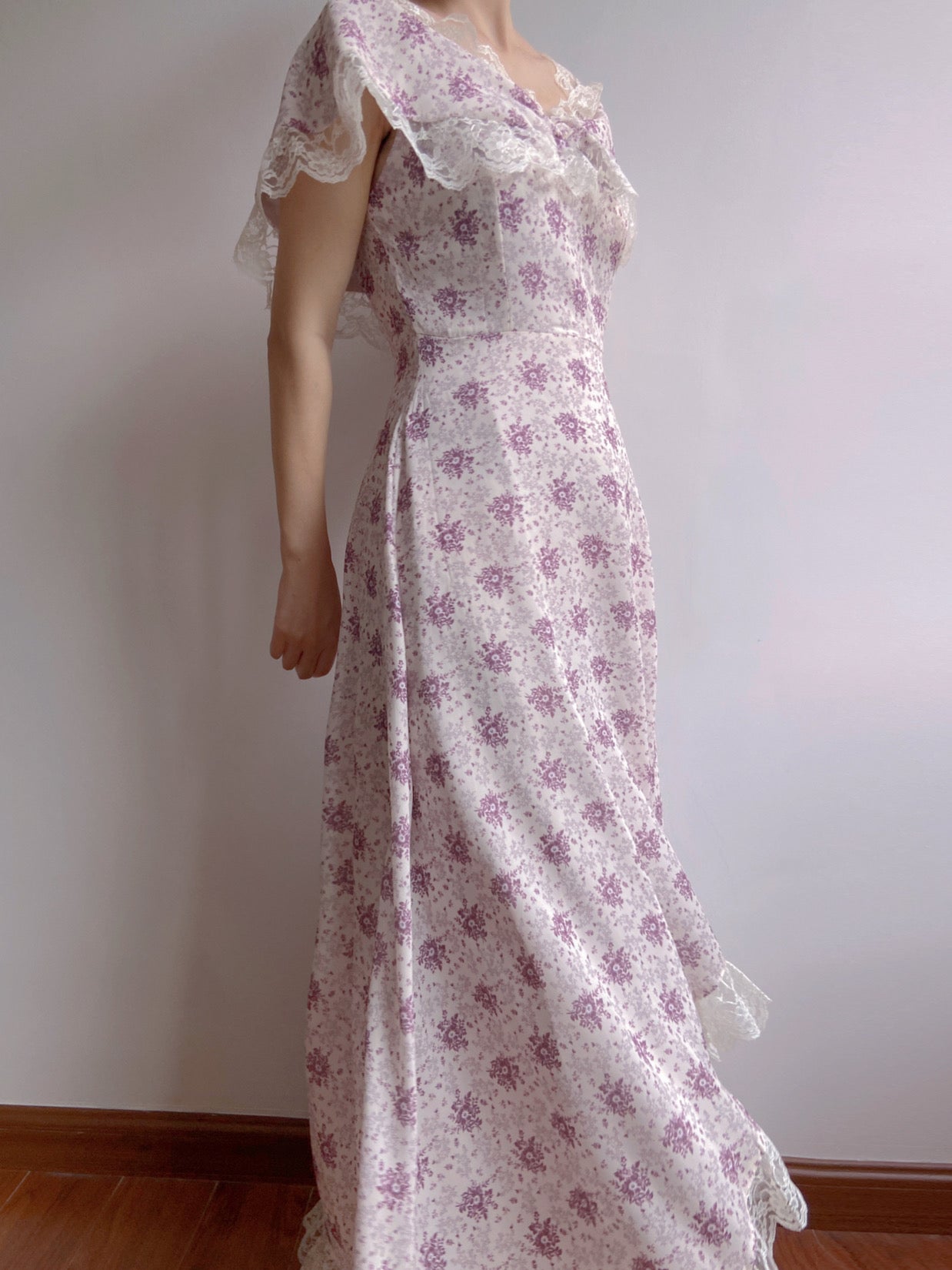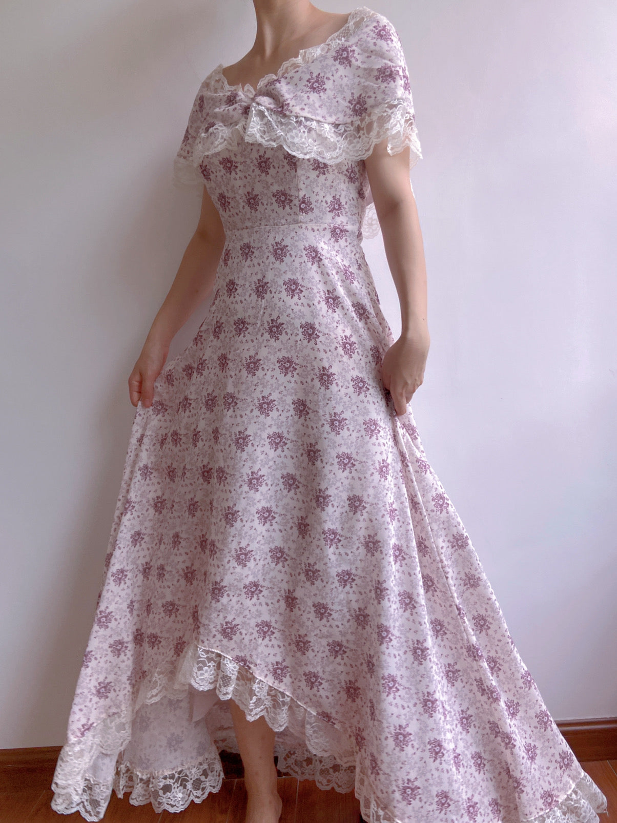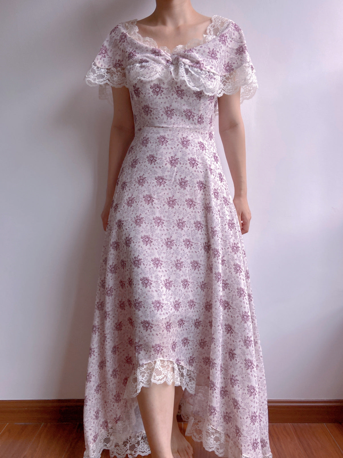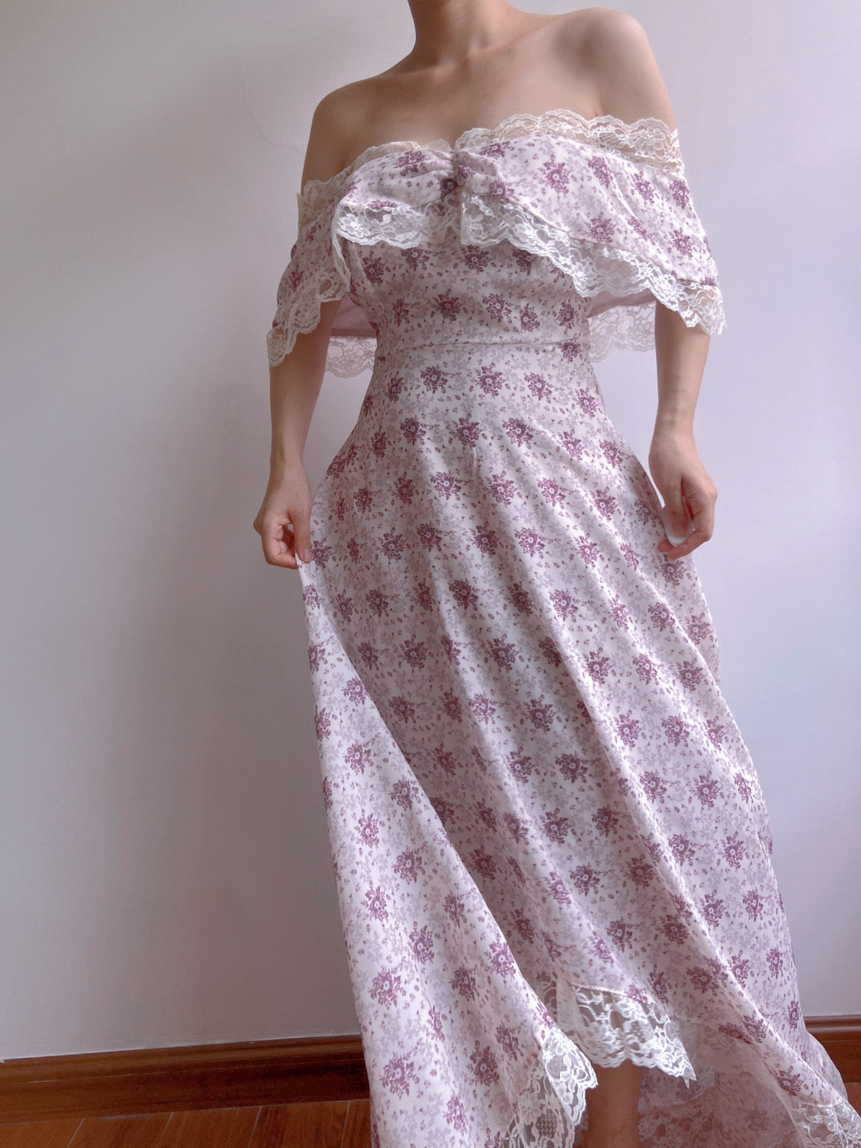 This sophisticated Lavender Field Dress is perfect for special occasions. The elegant purple color, vintage style, and romantic floral pattern evoke a sense of timeless beauty. An off-shoulder design, ruffles, and lace around the neckline create a distinctively feminine look. The short puff sleeves and slim-fit silhouette emphasize the feminine curves of the body. Make a lasting impression in this unique maxi dress.