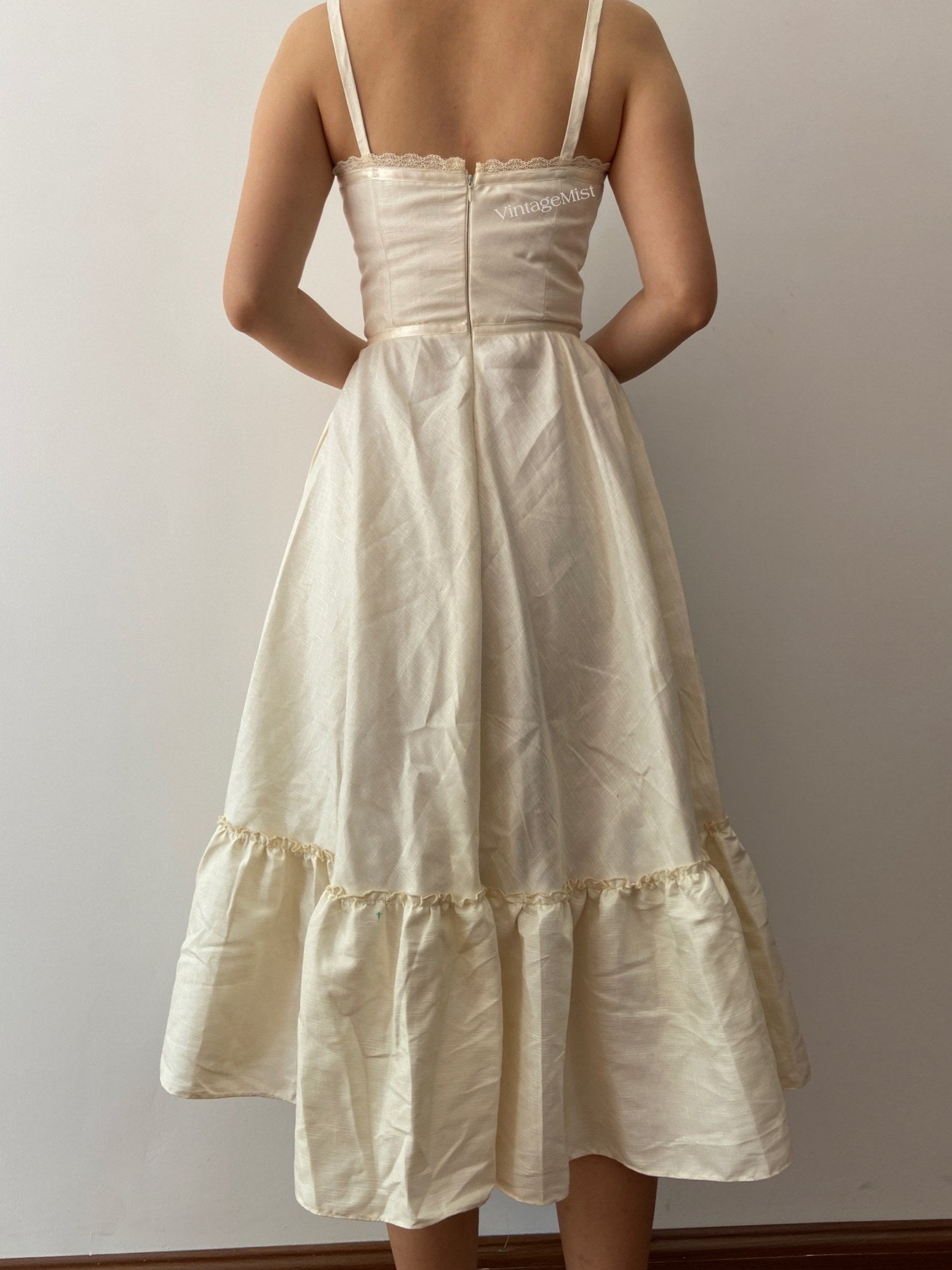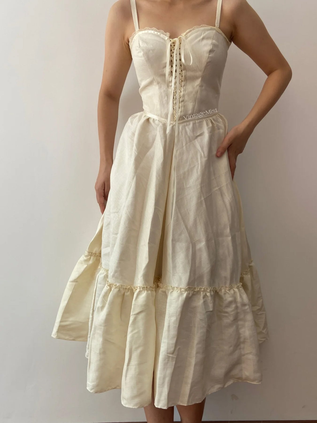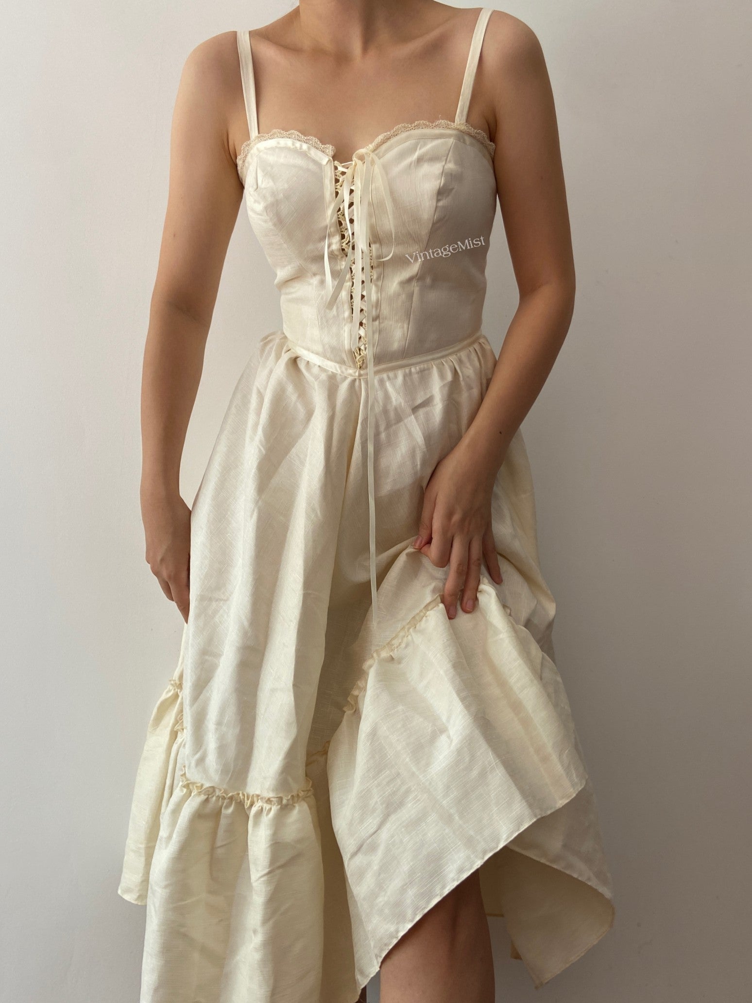 This gorgeous Strap Ruffle Corset Midi Dress is the perfect combination of modern and vintage style. Crafted from 100% cotton fabric, this sleeveless dress features a square neckline, lace-up front, back zip closure, and high-waisted fit. The strap and ruffle details create a beautiful flared look at the hem, for a timeless look you'll love.
